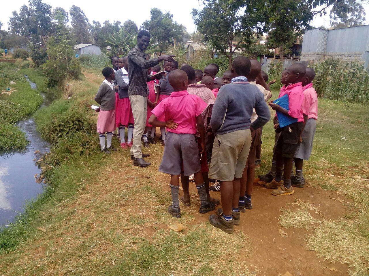 On this topic, we defined water pollution as the act of making water harmful. Since the students had been taught on waste, it was easy for us to identify the two types of waste; solid and liquid. Our reference point was River Nairobi which just flows next to the school. Some of the common pollutants identified within the water body are plastic papers and bottles, pampers, torn clothes, sewage, and faeces.
